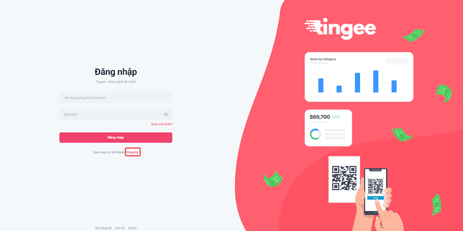 Bước 1: Truy cập trang chủ Tingee https://app.tingee.vn và nhấn vào Đăng ký