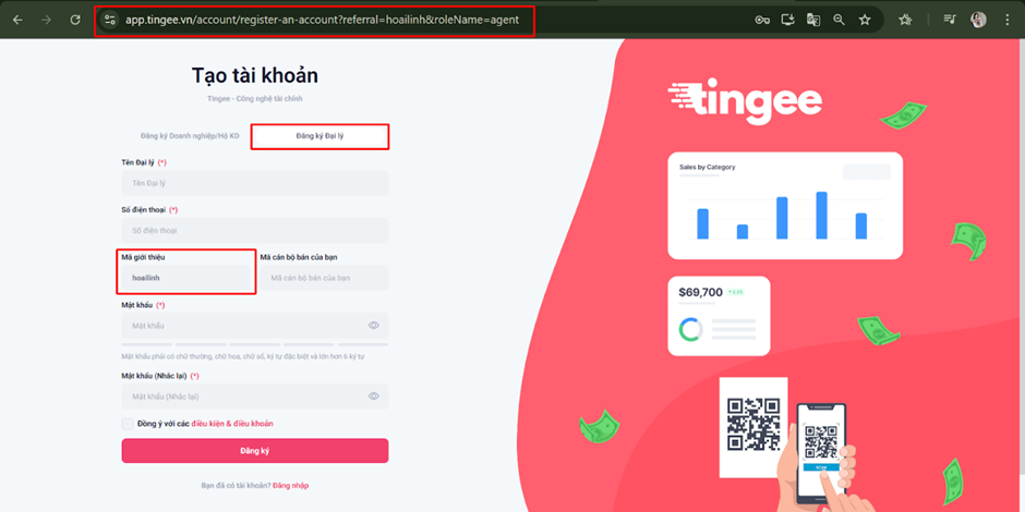 Lưu ý: Sau khi đăng ký bằng đường dẫn giới thiệu, hệ thống sẽ tự hiển thị mã giới thiệu và bạn sẽ trở thành Đại lý cấp dưới.