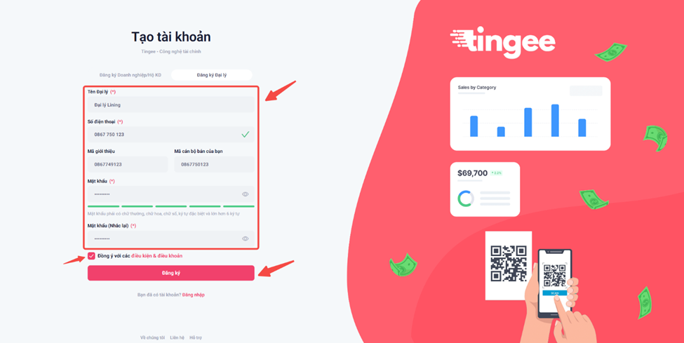 Bước 3: Điền thông tin Đăng ký Đại lý → Chọn Đồng ý với điều kiện và điều khoản → Bấm Đăng ký