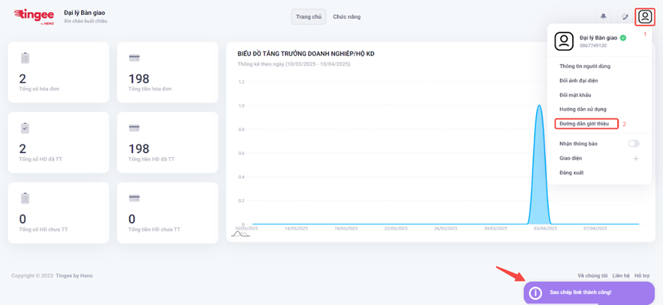 - Di chuột qua avatar người dùng → Chọn Sao chép đường dẫn giới thiệu → Hệ thống hiển thị thông báo “Sao chép thành công”