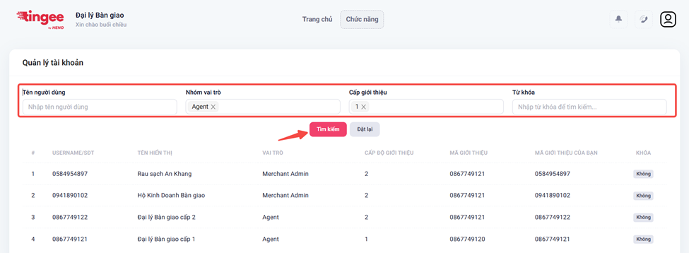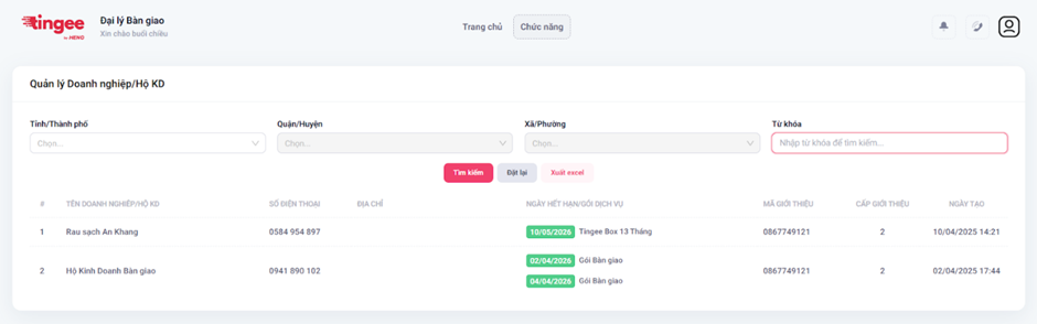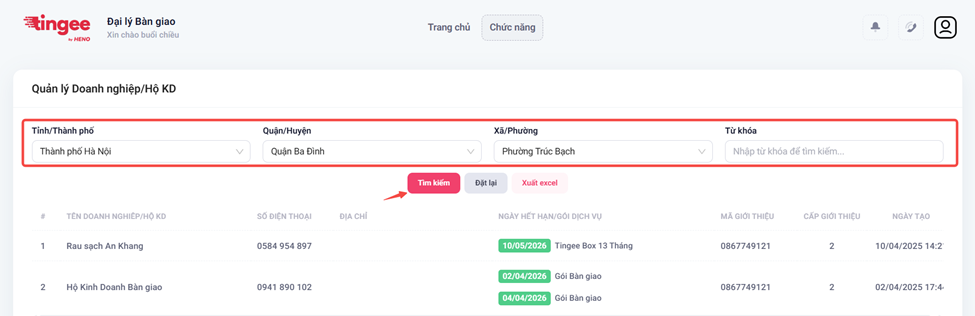 - Lọc theo Tỉnh/Thành phố → Quận/huyện → Xã/phường hoặc nhập từ khóa → Bấm Tìm kiếm