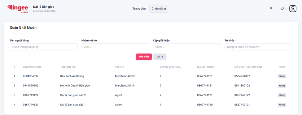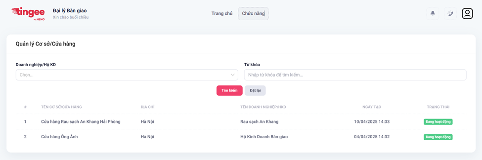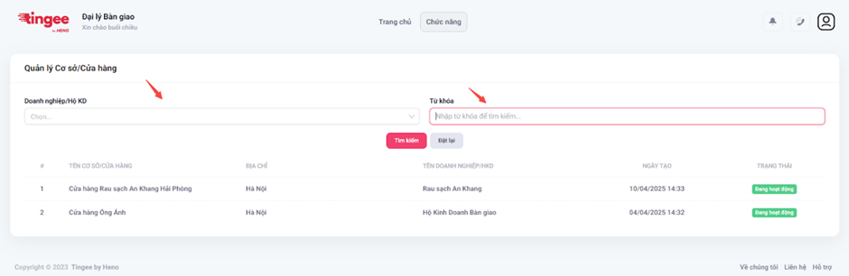 - Hệ thống hiển thị danh sách Cơ sở/Cửa hàng cấp dưới của Đại lý