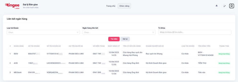 - Xem danh sách các tài khoản ngân hàng được liên kết theo Cơ sở/Cửa hàng