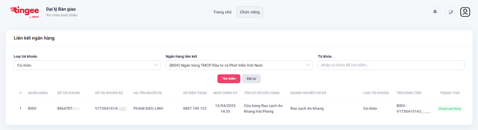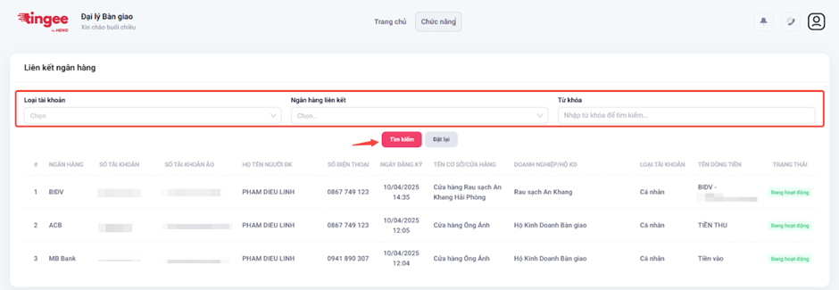 - Tìm kiếm theo: Loại tài khoản, Ngân hàng liên kết, Số tài khoản, Số tài khoản ảo → Bấm Tìm kiếm