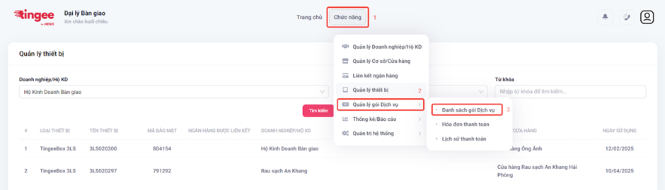 - Chọn Chức năng → Quản lý gói Dịch vụ → Danh sách Gói dịch vụ