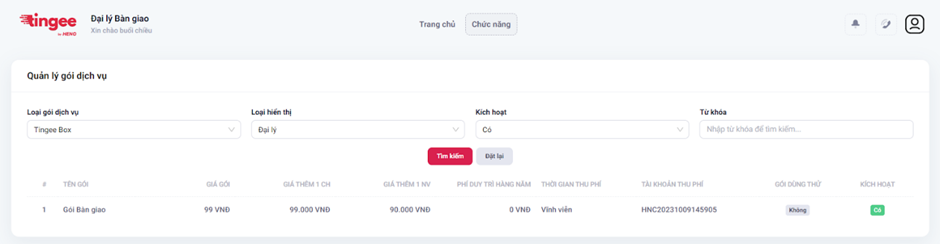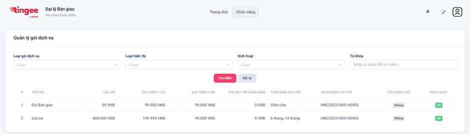 - Nhấn Tìm kiếm. Hệ thống hiển thị danh sách gói dịch vụ tương ứng