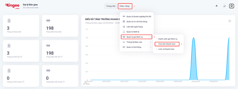 - Chọn Chức năng → Quản lý gói Dịch vụ → Hóa đơn thanh toán
