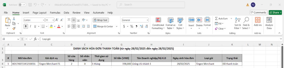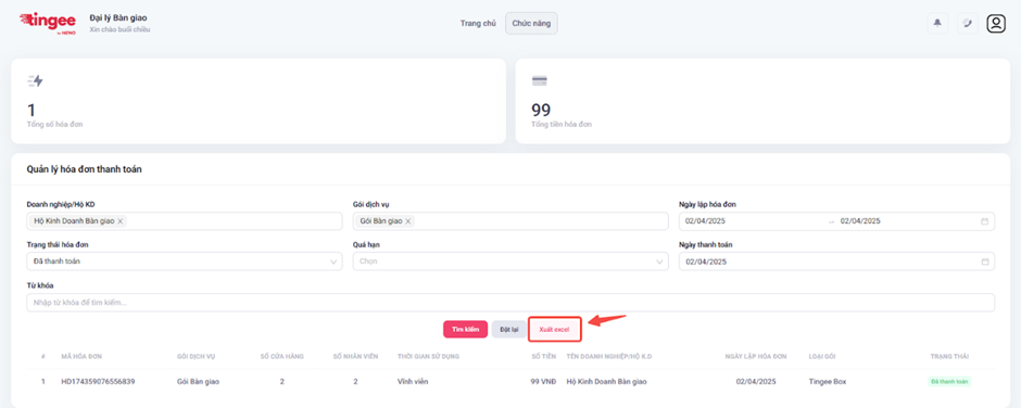 - Xuất Excel: Nhấn Xuất Excel → Mở file tải xuống