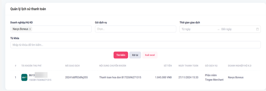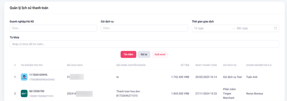 - Xem danh sách lịch sử thanh toán